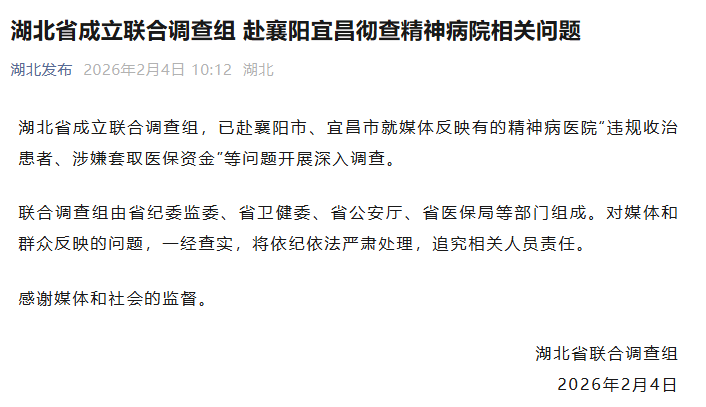 湖北省成立联合调查组,已赴襄阳市、宜昌市就媒体反映有的精神病医院“违规收治患者、涉嫌套取医保资金”等问题开展深入调查。