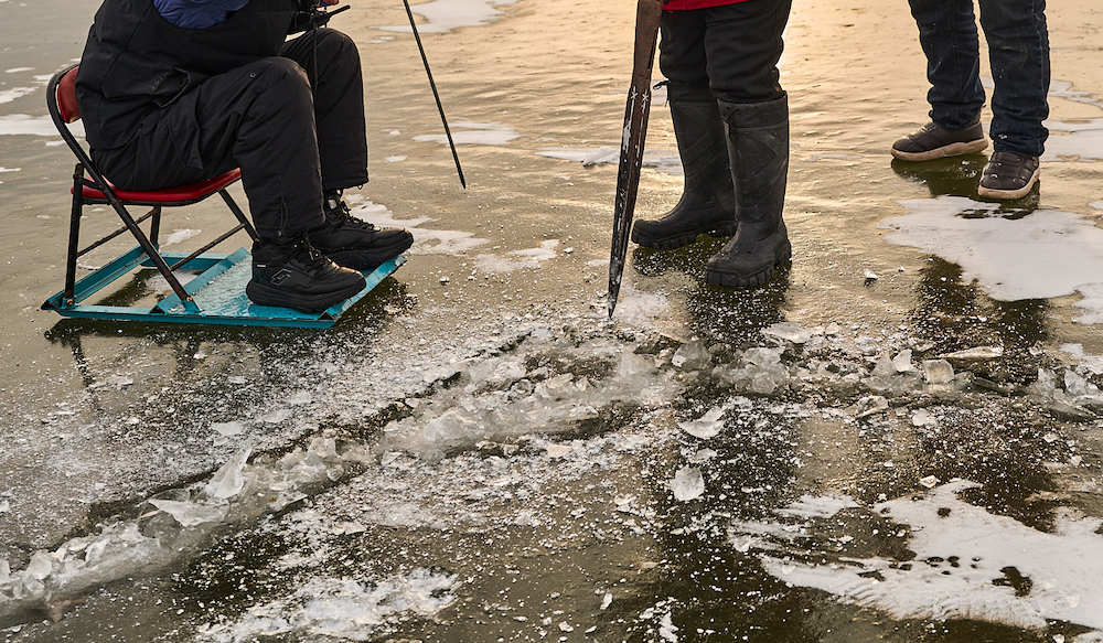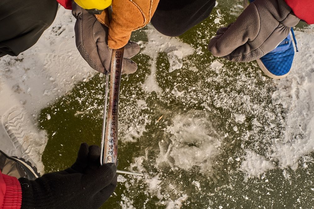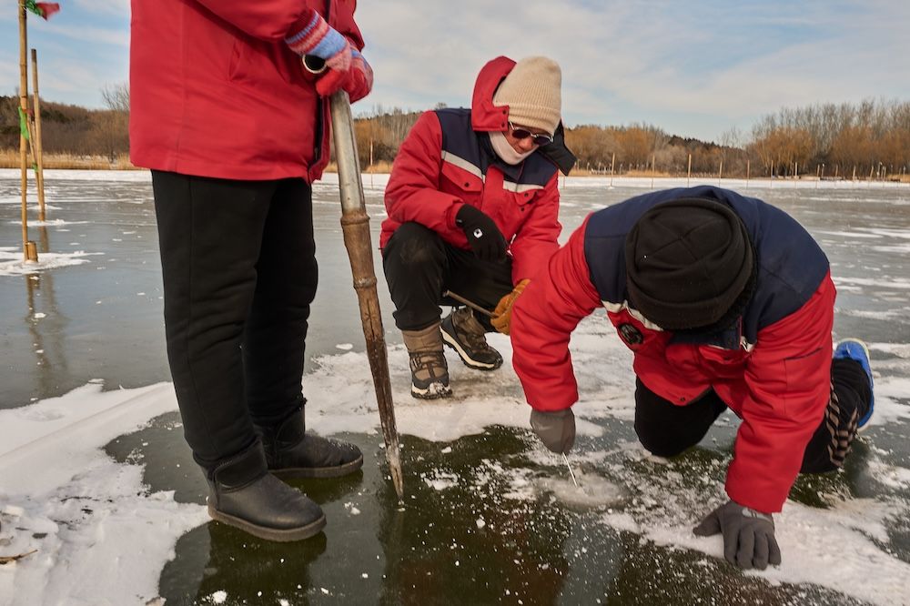 白洋淀人天生“懂水”,老家的人把这种经验称为“懂凌水”。凌,就是冰。刘闯在冰面上走一圈,看一眼冰的颜色,听一听脚下的回声,就知道这块冰够不够结实。为了精准,“冰客”们每天三次测量冰的厚度,在冰场边缘打孔,将尺子探下去,15厘米是安全线。