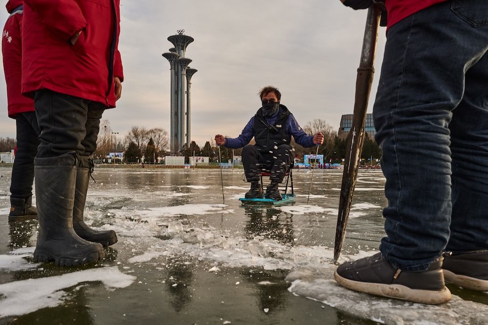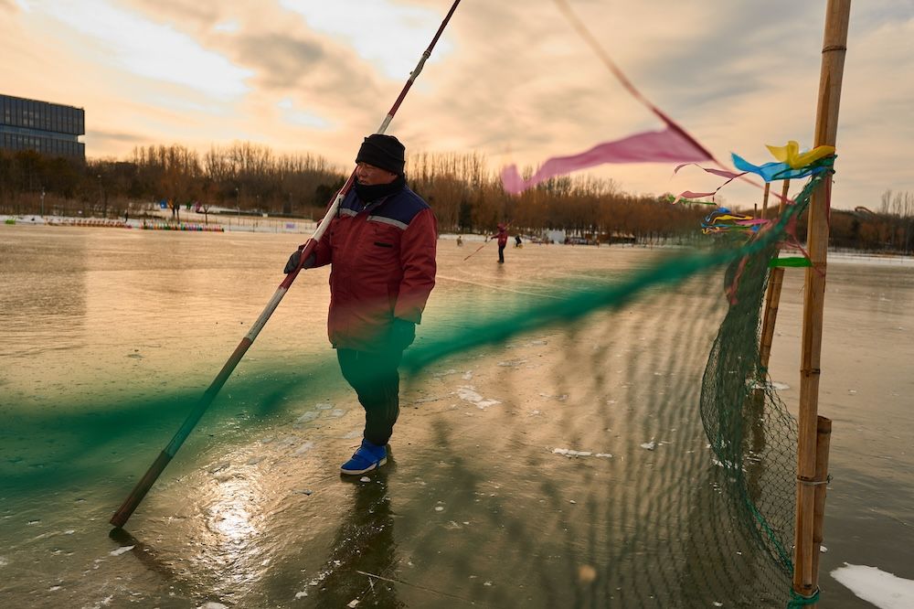傍晚时,奥森公园的落日余晖洒在冰面上,折射到这些白洋淀人的脸上。他们的皱纹很深,眼神很亮。他们展现出来的不仅是手艺,更有一种不惧严寒的性格。
