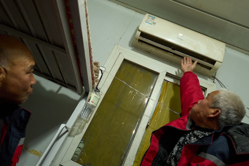 工友们回到宿舍打开空调取暖。
