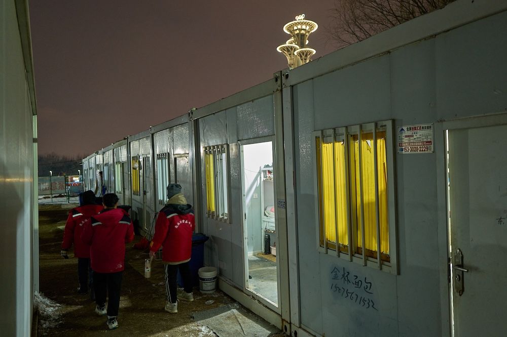 17:30,冰场关闭。工友们走向宿舍,谈论着晚餐吃什么。集装箱宿舍里的灯逐渐亮了起来。