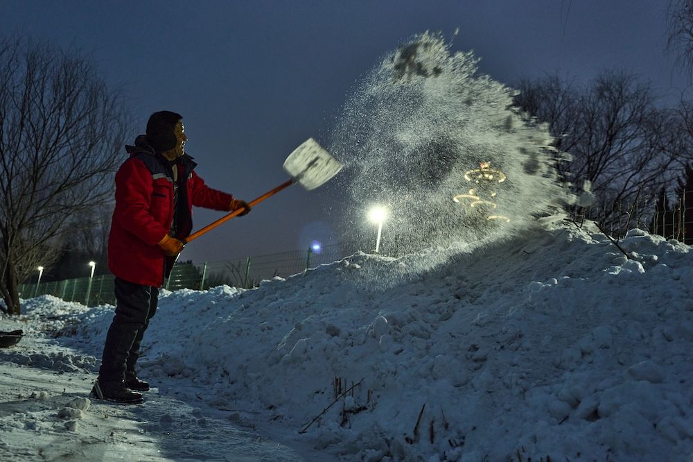 2026年1月18日,奥森公园冰场,一个工友正在清理积雪。