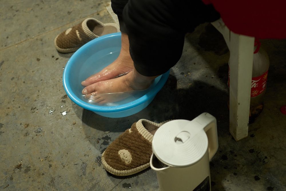 宿舍内,工友用热水烫脚,舒缓身体的疲乏。