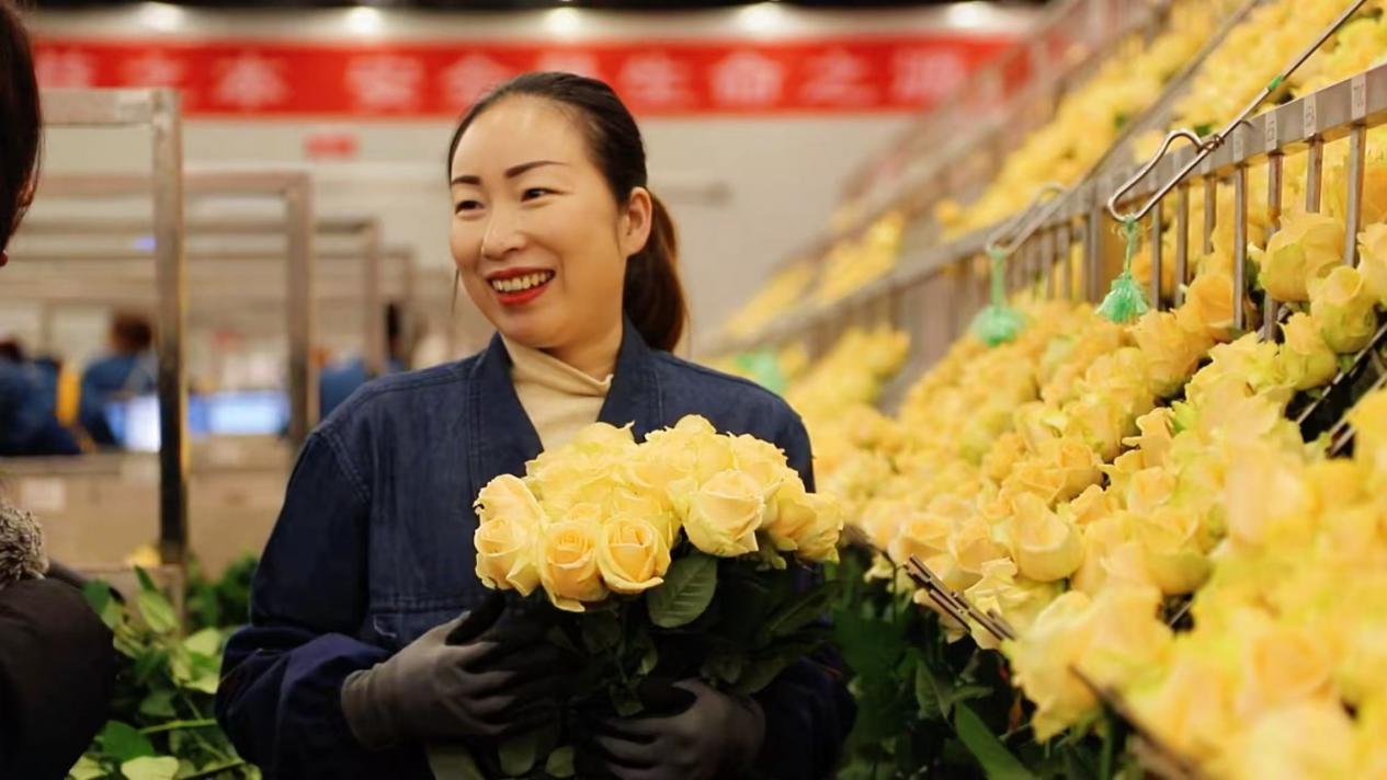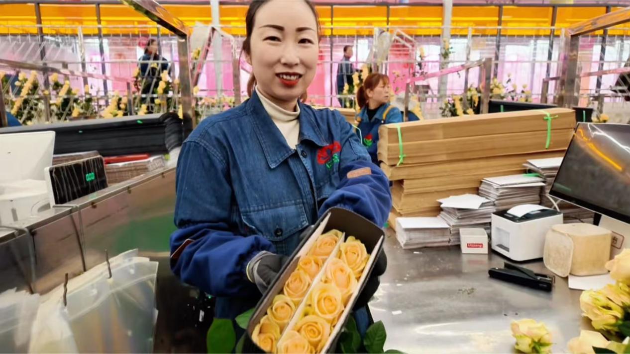 基地里,玫瑰以每40天一茬的速度茁壮生长,日产鲜切花达20万枝。企业提供了超过500个就业岗位,不仅吸引本村村民,还有很多来自周边县区的务工者。许多像婷婷一样的女工,在这里找到了人生第一份工作。
