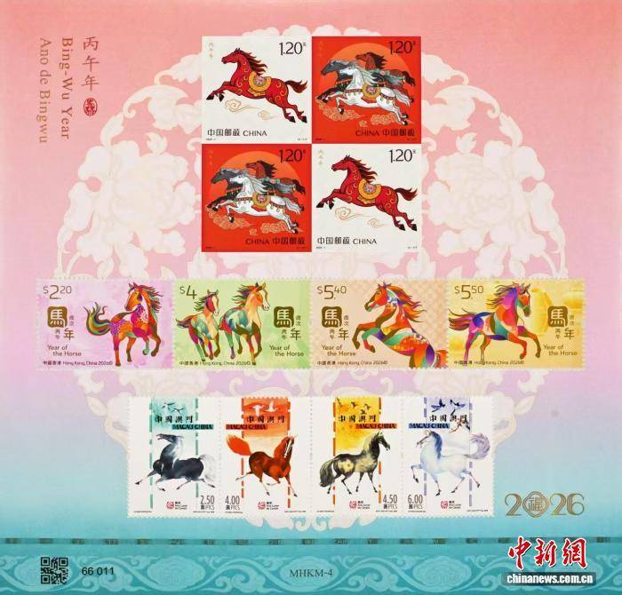 2026年1月5日,中国邮政《丙午年》特种邮票发行。《丙午年》特种邮票全套共2枚,第一枚邮票图案名为“驰跃宏图”,第二枚邮票图案名为“万骏臻福”。当日,中国邮政携手港、澳邮政部门共同印制的生肖同题材邮票小全张同步揭幕。中国邮政集团供图