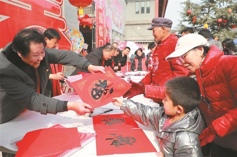 2月6日,在合阳县年货节现场,流动党员成永民(左一)向群众赠送福字。春节前夕,合阳县利用外出流动党员集中返乡契机,开展“归巢暖心”系列活动,通过政策宣讲、上门走访、困难帮扶、文化宣传等方式,精准掌握流动党员思想动态与实际需求,引导他们发挥自身优势,为家乡发展建言献策、发光发热。 本报通讯员 崔正博摄