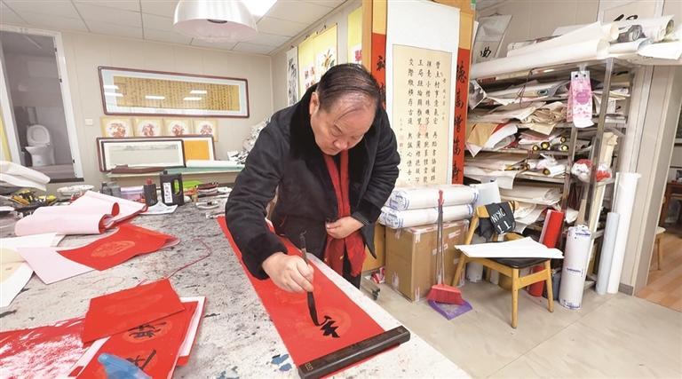 记者见到周占宏时,他书案前已经码放了不少写好的春联,不时仍有居民前来,他逐一询问大家对春联内容的偏好,耐心满足不同需求。