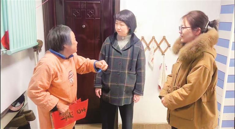刘媛媛(中)看望独居老人陶桂英。