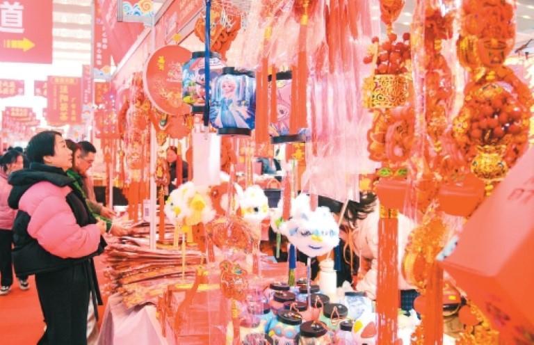 “这是我们刚做的年画拓印,感觉挺有意思的。在这里不仅买到了年货,还让孩子长了知识。”现场,记者碰到带女儿来逛会的张女士,她们刚在非遗国潮体验展区进行了体验。年货会上的非遗国潮体验也成为一个亮点,现场有非遗国潮好物、工艺礼品、年庆文化用品、糖画、泥叫叫、年画拓印、书画、扎染、剪纸、猜灯谜等数十项非遗文创体验展示推广。