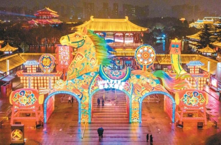 大唐芙蓉园西门外的“马年”特色花灯 记者 王健 摄