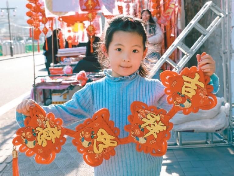 图为2月9日,一个小女孩选到“吉祥如意”的新春挂饰后,高兴地进行展示。