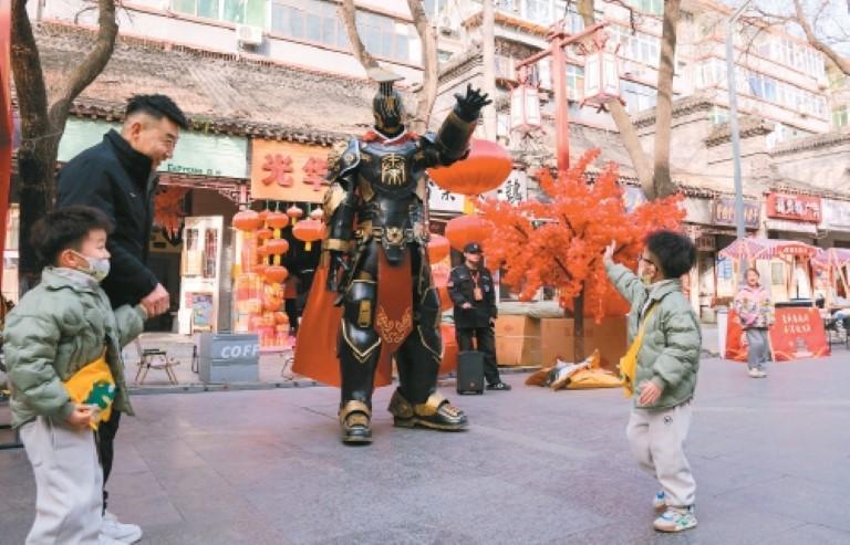 图为2月11日,咸阳市渭城区中山老街,小朋友被身着“秦俑机甲”的表演者吸引,招手与其互动。