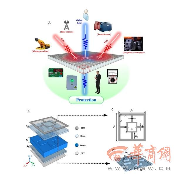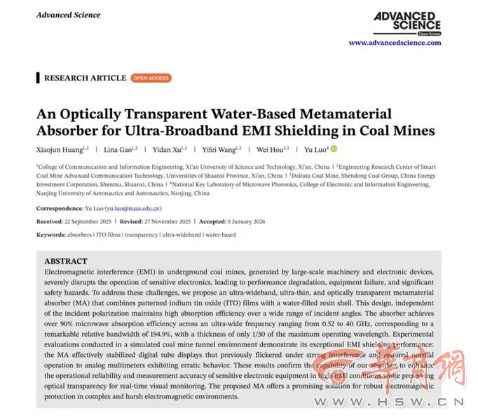 如今,这一困境被西安科技大学科研团队成功破解。西安科技大学黄晓俊教授团队联合南京航空航天大学等单位,在国际顶级期刊《Advanced Science》发表最新研究成果,研发出一种光学透明水基超材料吸收器。这款被称为“透明电磁盾牌”的黑科技,实现了0.52-40GHz超宽频率范围内90%以上的电磁干扰吸收,相对带宽高达194.9%,厚度却仅为最大工作波长的1/50,完美兼顾防护性能与视觉监控需求,为智能采矿安全提供了全新解决方案。