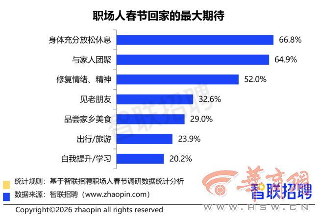 问及春节职场人回家的最大期待,66.8%将“身体充分放松休息”列为首选,渴望借假期修复一年工作的疲惫;64.9%盼望“与家人团聚”,希望在亲情陪伴中获得情感慰藉。从“拼事业”到“重疗愈”,职场人对春节的期待愈发回归本质,既追求身体的休养生息,也看重情感的滋养共鸣。