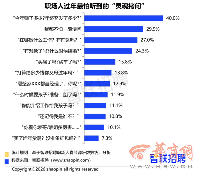 放假安排上,36.1%的职场人严格遵循法定节奏,仅享受15日-23日的9天假期;而14.6%的职场人选择今年不回家过年,“外地过年”逐渐成为部分职场人的选择。