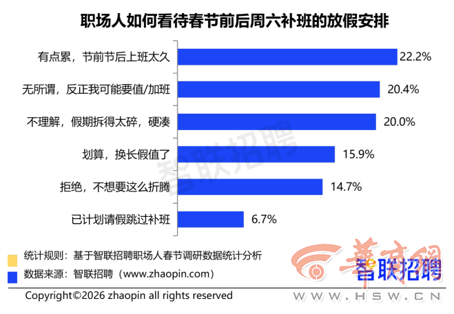 针对“春节前后各补班1天,拼9天长假”的调休安排,职场人的抵触情绪较为明显。其中22.2%的职场人表示“节前节后连续上班太累”,占比最高;20%的人明确表示“不理解这种硬凑的假期”,认为拆分的休息缺乏完整性与舒适度。