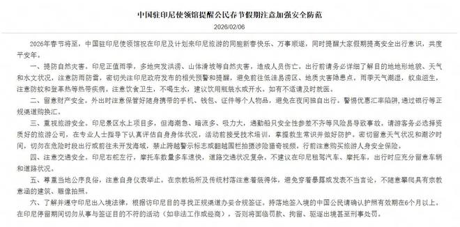 据中国驻登巴萨总领馆微信公众号2月6日发文,中国驻印尼使领馆提醒春节假期注意加强安全防范,包括提防自然灾害、重视旅游安全、注意交通安全等。13日下午,极目新闻记者就此事联系上中国驻登巴萨总领馆,一名工作人员告诉记者,已经跟当事人的家属进行了联系,对此事的具体情况不方便透露。