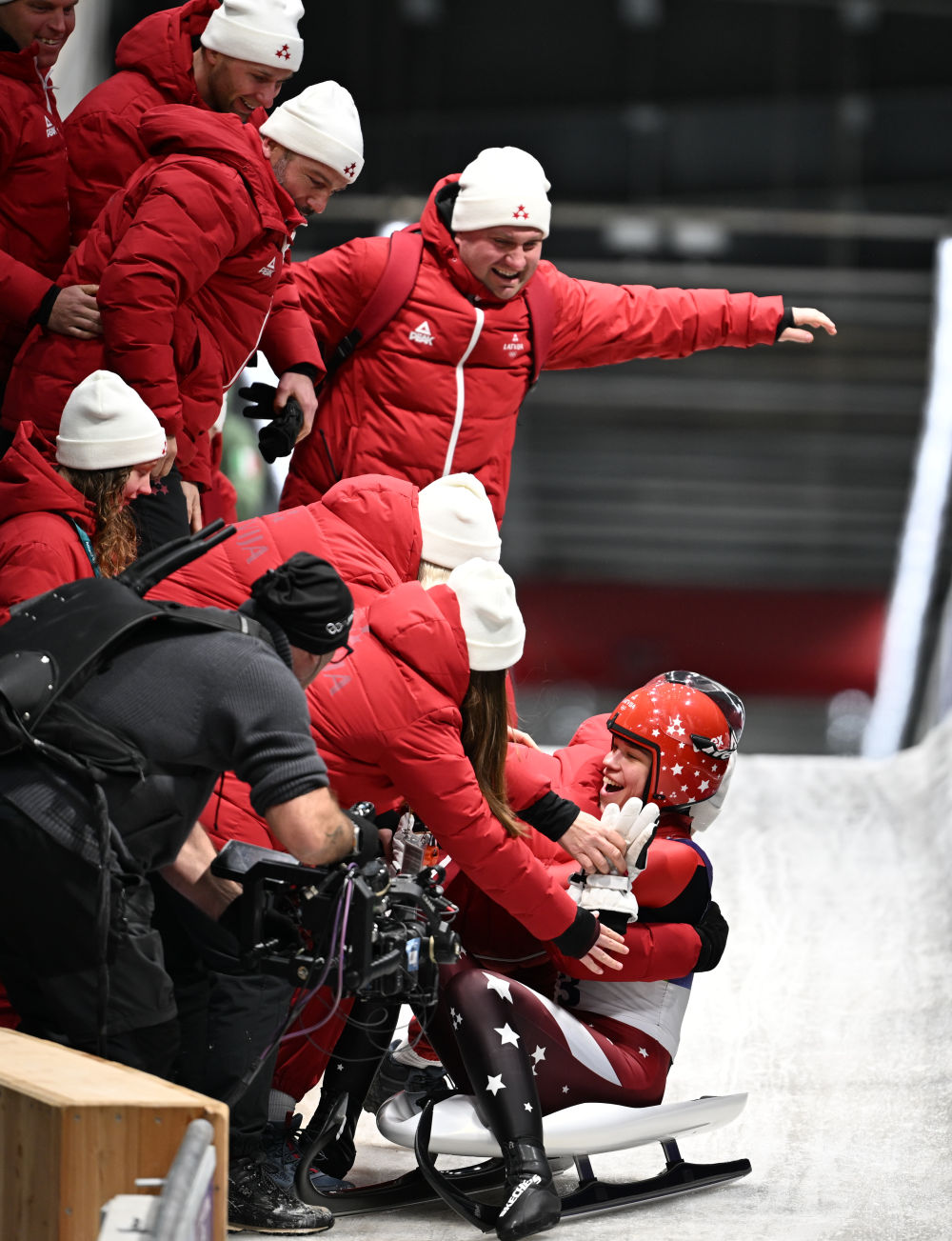 2月10日,拉脱维亚选手博塔(后)在雪橇项目女子单人赛后庆祝。新华社记者 连漪 摄