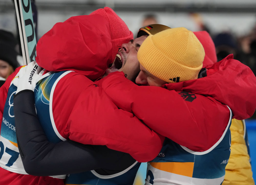 2月9日,冠军德国选手菲利普·雷蒙德(中)在跳台滑雪男子个人标准台比赛后庆祝。新华社记者 孟永民 摄