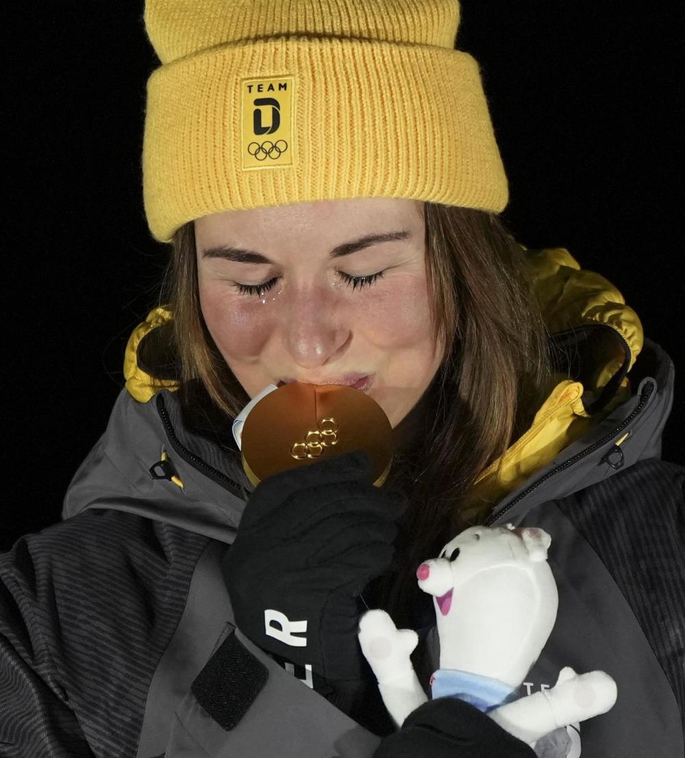 2月10日,冠军德国选手陶比茨在雪橇项目女子单人赛颁奖仪式上。新华社记者 李钢 摄