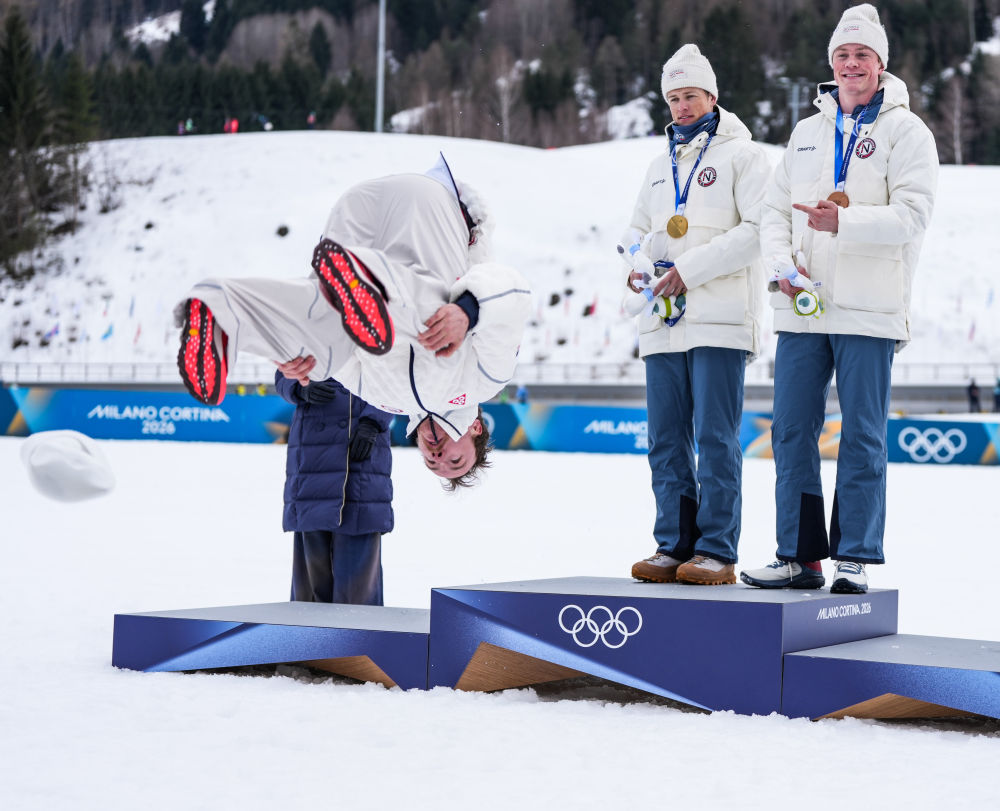 2月10日,亚军美国选手奥格登在越野滑雪男子个人短距离(传统技术)颁奖仪式上表演后空翻。新华社记者 彭子洋 摄