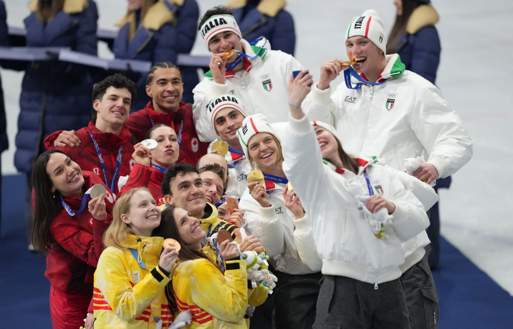 2月10日,冠军意大利队(右)、亚军加拿大队(左上)和季军比利时队在短道速滑混合团体接力颁奖仪式上合影。新华社记者 薛宇舸 摄