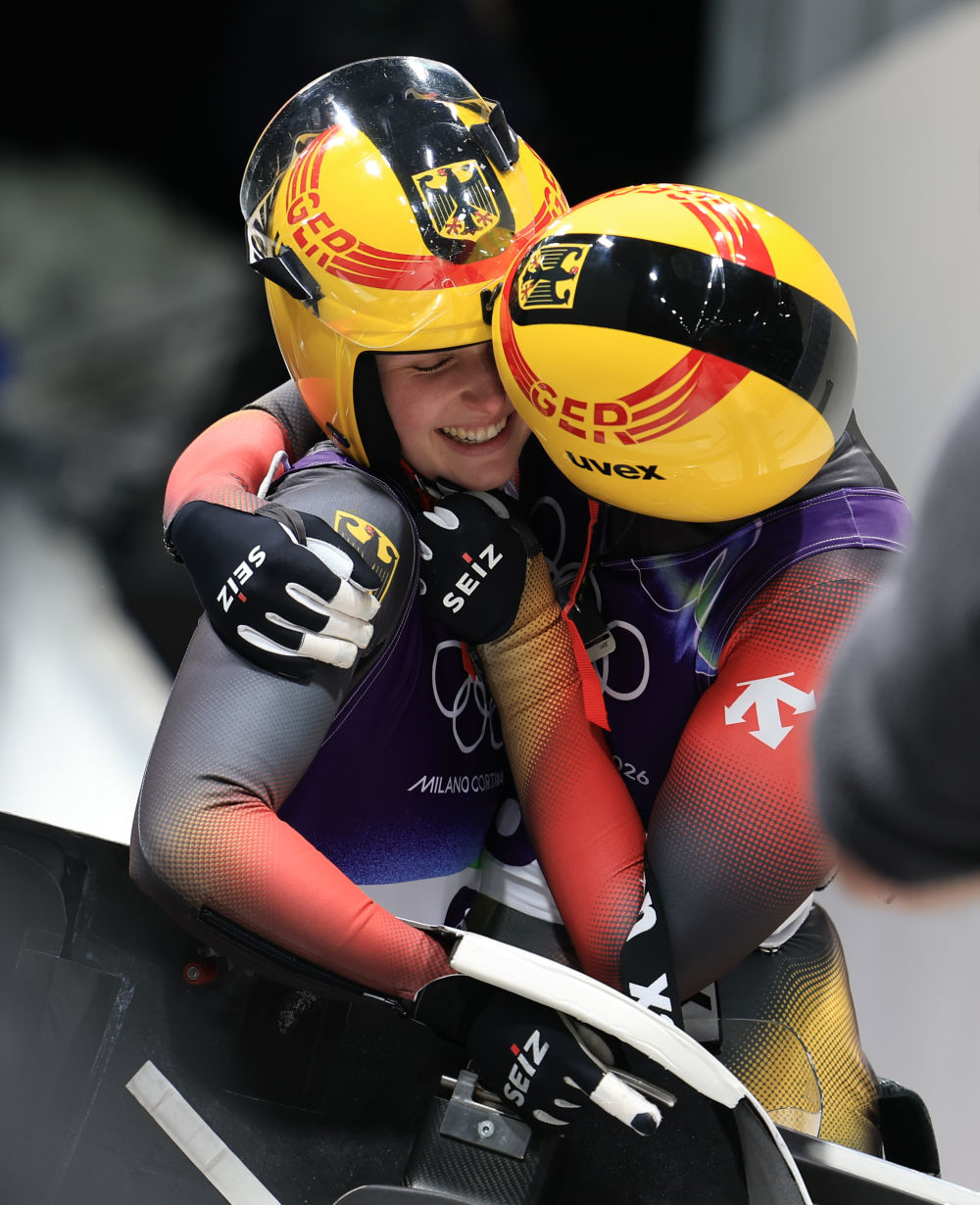 2月11日,德国选手达亚娜/玛格达莱娜在雪橇女子双人赛后庆祝。新华社记者 丁旭 摄