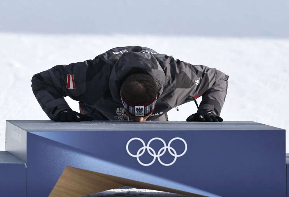 2月8日,冠军奥地利选手本亚明·卡尔在单板滑雪项目男子平行大回转比赛颁奖仪式上亲吻领奖台。新华社记者 王鹏 摄