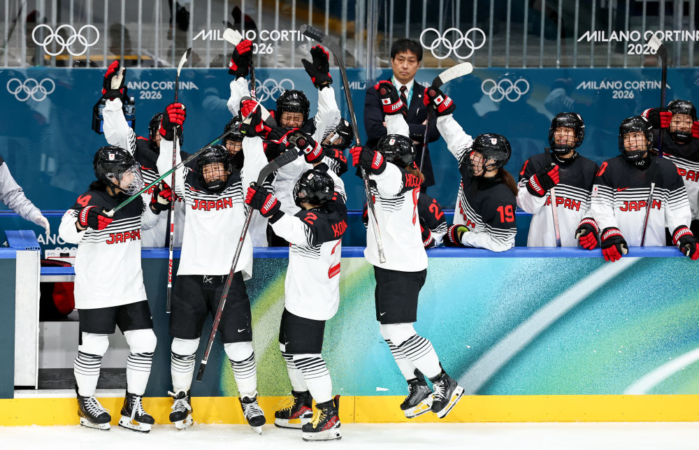 2月9日,日本队球员在冰球项目女子小组赛B组比赛中庆祝进球。新华社记者 王楷焱 摄