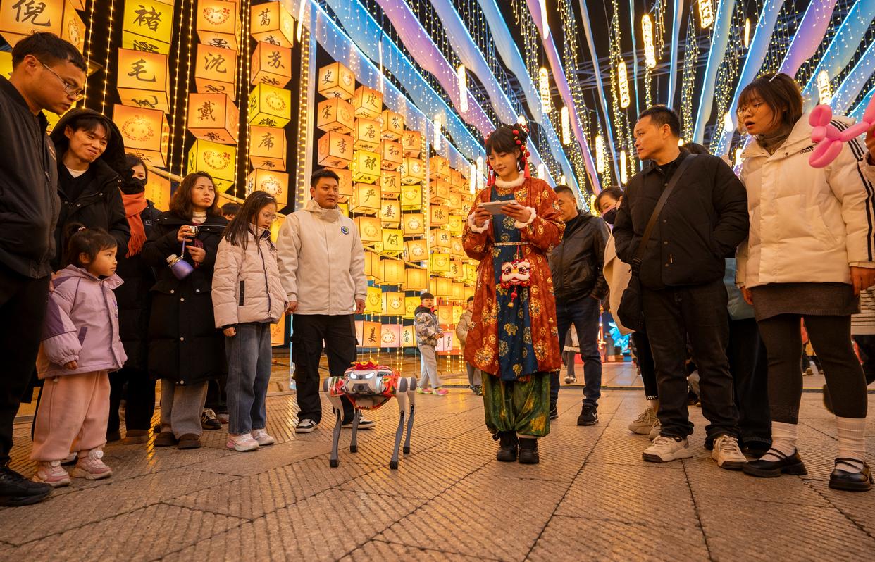 2月11日,在江西省新余市仙女湖新春灯会上,机器狗吸引了游人的目光。新华社发(赵春亮 摄)