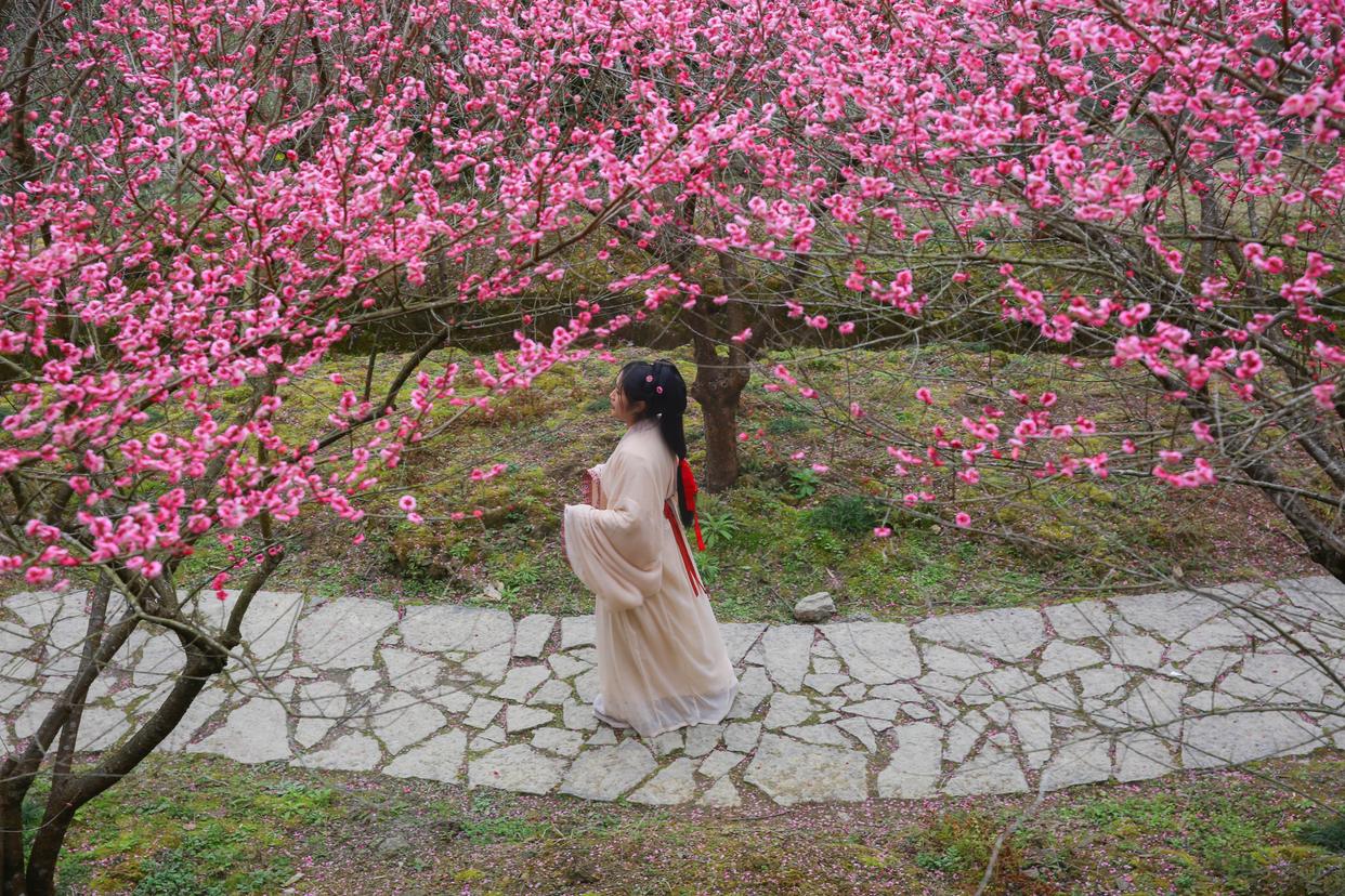 2月12日,游客在湖南省湘西土家族苗族自治州永顺县灵溪镇土家竹梅山寨陈家坡赏梅。新华社发(曾勇 摄)