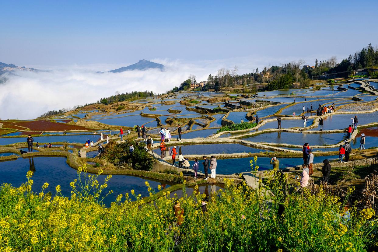 2月12日,游客在云南省元阳县新街镇爱春梯田景区游览。新华社发(张洪科 摄)