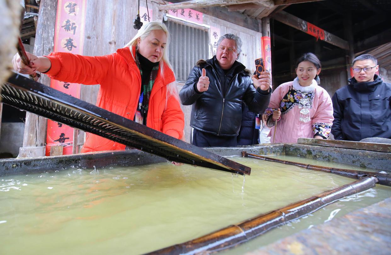 2月12日,在湖南省湘西土家族苗族自治州永顺县灵溪镇洞坎村,游客体验湘西手工抄纸。新华社发(曾勇 摄)