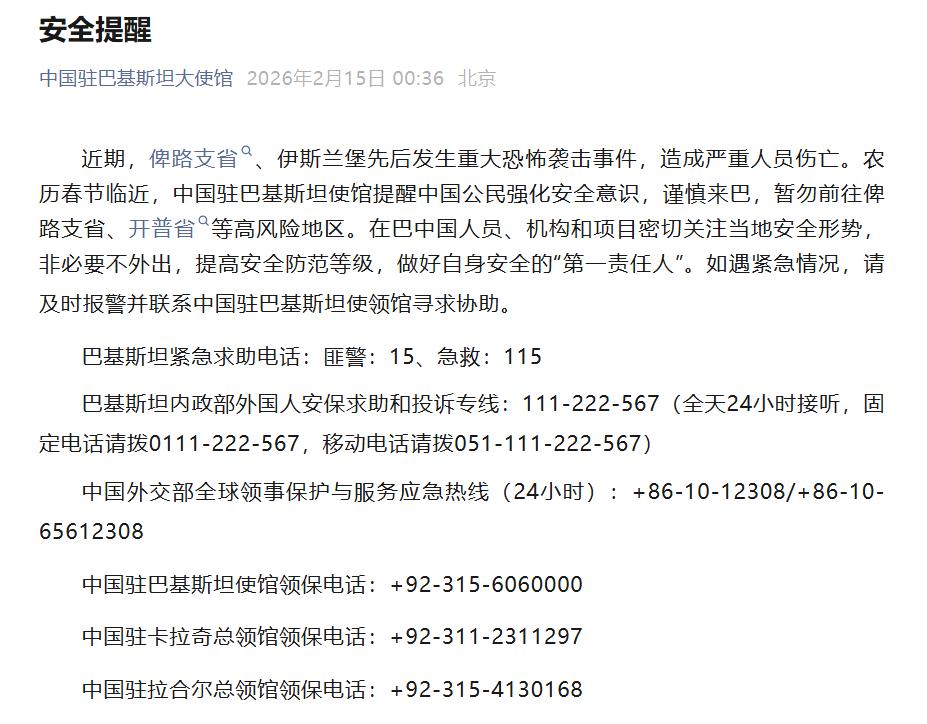 2月15日,据中国驻巴基斯坦大使馆消息:近期,俾路支省、伊斯兰堡先后发生重大恐怖袭击事件,造成严重人员伤亡。农历春节临近,中国驻巴基斯坦使馆提醒中国公民强化安全意识,谨慎来巴,暂勿前往俾路支省、开普省等高风险地区。在巴中国人员、机构和项目密切关注当地安全形势,非必要不外出,提高安全防范等级,做好自身安全的“第一责任人”。如遇紧急情况,请及时报警并联系中国驻巴基斯坦使领馆寻求协助。