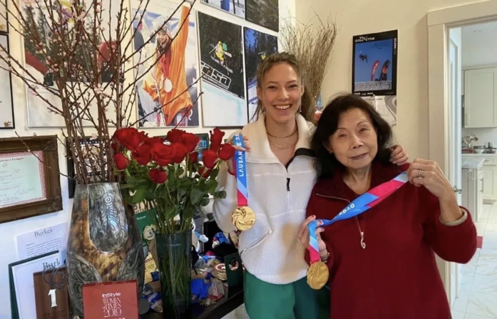 外婆冯国珍(中)也是谷爱凌成长过程中对她产生极大影响的人。然而在米兰冬奥会的全部征程结束后,谷爱凌才得知外婆在冬奥期间因病离世。
