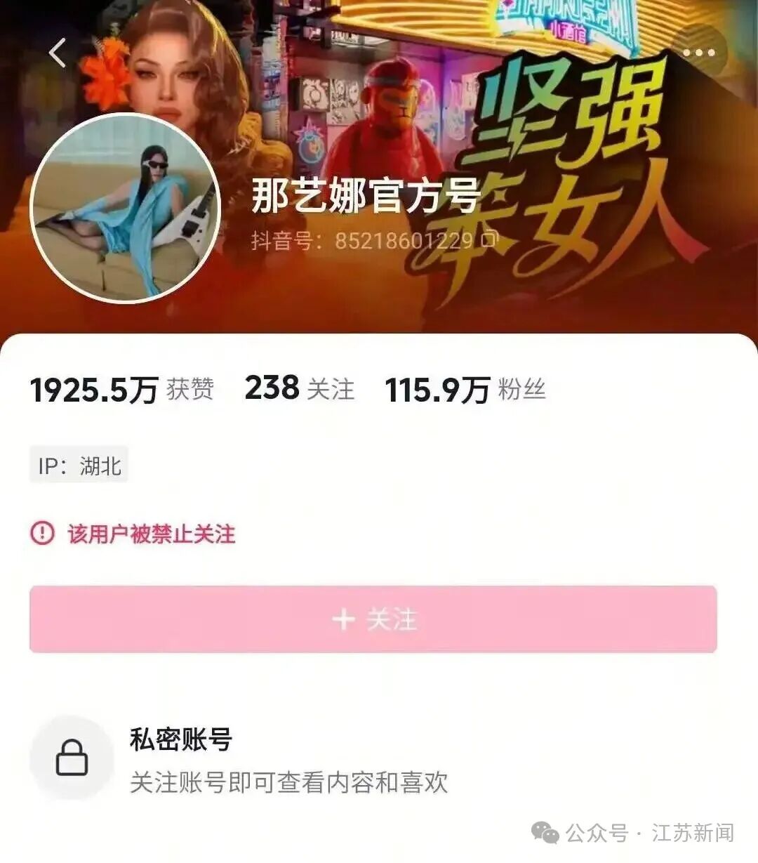 媒体2月23日报道,近日登录抖音平台后发现,那艺娜多个账号被禁止关注,视频已被清空,在搜索栏也已无法找到其账号。