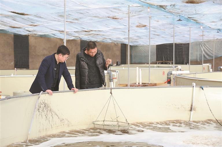 2月11日,位于定边县盐场堡镇花马池盐湖旁的养殖车间里,技术员在查看南美白对虾的生长情况。 本报通讯员 叶子摄