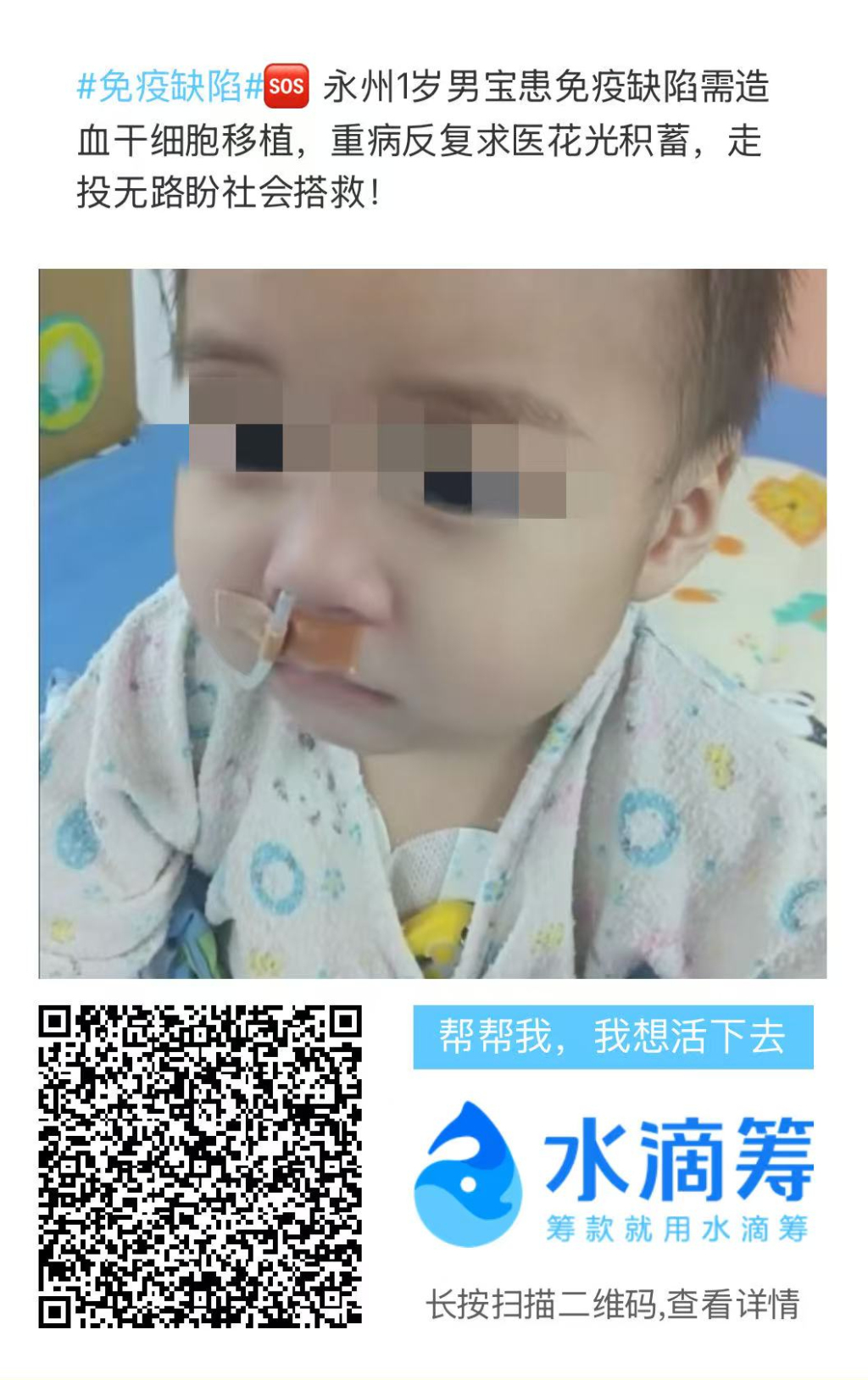 湖南永州吕先生的1岁儿子洋洋出生不久后即确诊原发性免疫缺陷症,历经多次重症抢救仍在持续治疗。如今,造血干细胞移植成为孩子唯一有效的治疗途径,但巨额的医疗开销让普通家庭不堪重负,吕先生无奈之下向社会发起筹款,希望为孩子争取更多治疗机会。