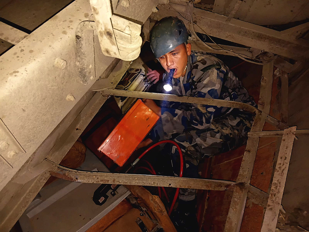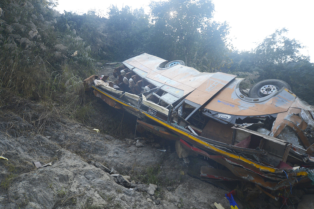 尼泊尔武装警察部队的救援人员在巴士事故现场搜救遇难者遗体和伤者。