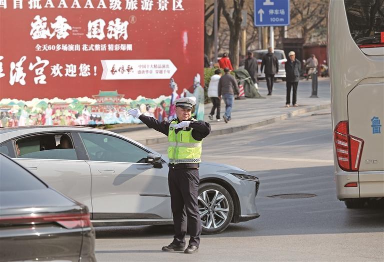 2月22日,在西安市临潼区华清宫景区附近的秦唐大道和牡丹路十字,交警在指挥交通。本报通讯员 王三合摄