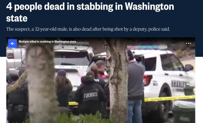 据美媒报道,当地时间24日,美国华盛顿发生一起持刀袭击事件,造成至少4人死亡,嫌疑人已被击毙。