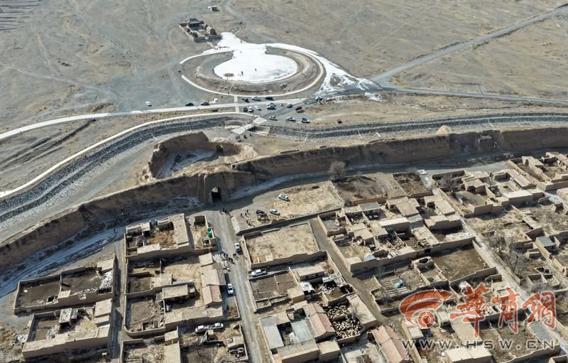 从西安出发七百余公里,视野渐次开阔。冬日戈壁苍茫,枯草覆着薄霜,远处寿鹿山轮廓冷峻。转过一道坡,一座完整的黄土古城豁然入目——这便是永泰古城。空中俯瞰如巨龟伏于戈壁,头尾四足俱全,故得“龟城”之名。部分修复后的古城南门贴上了红红的对联,为苍凉添了几分暖意。