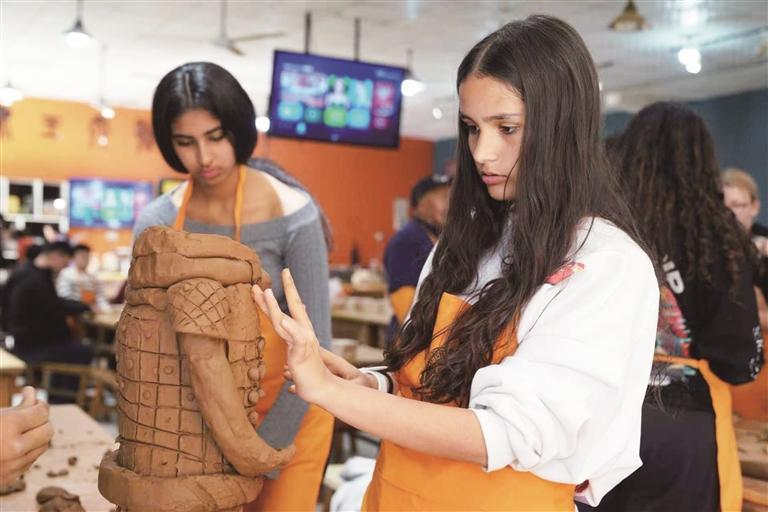 迪拜师生跃跃欲试,很快分组合作起来。有人负责盘筑躯干,有人专塑头部或手臂,有人细雕铠甲、花纹。经过两个多小时的努力,他们终于共同完成了3尊陶俑。当最后一尊陶俑成型时,大家开心地击掌庆贺,纷纷与自己制作的陶俑合影留念。