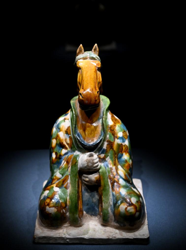 2月11日在郑州大象陶瓷博物馆拍摄的三彩坐姿午马俑。新华社记者 郝源 摄