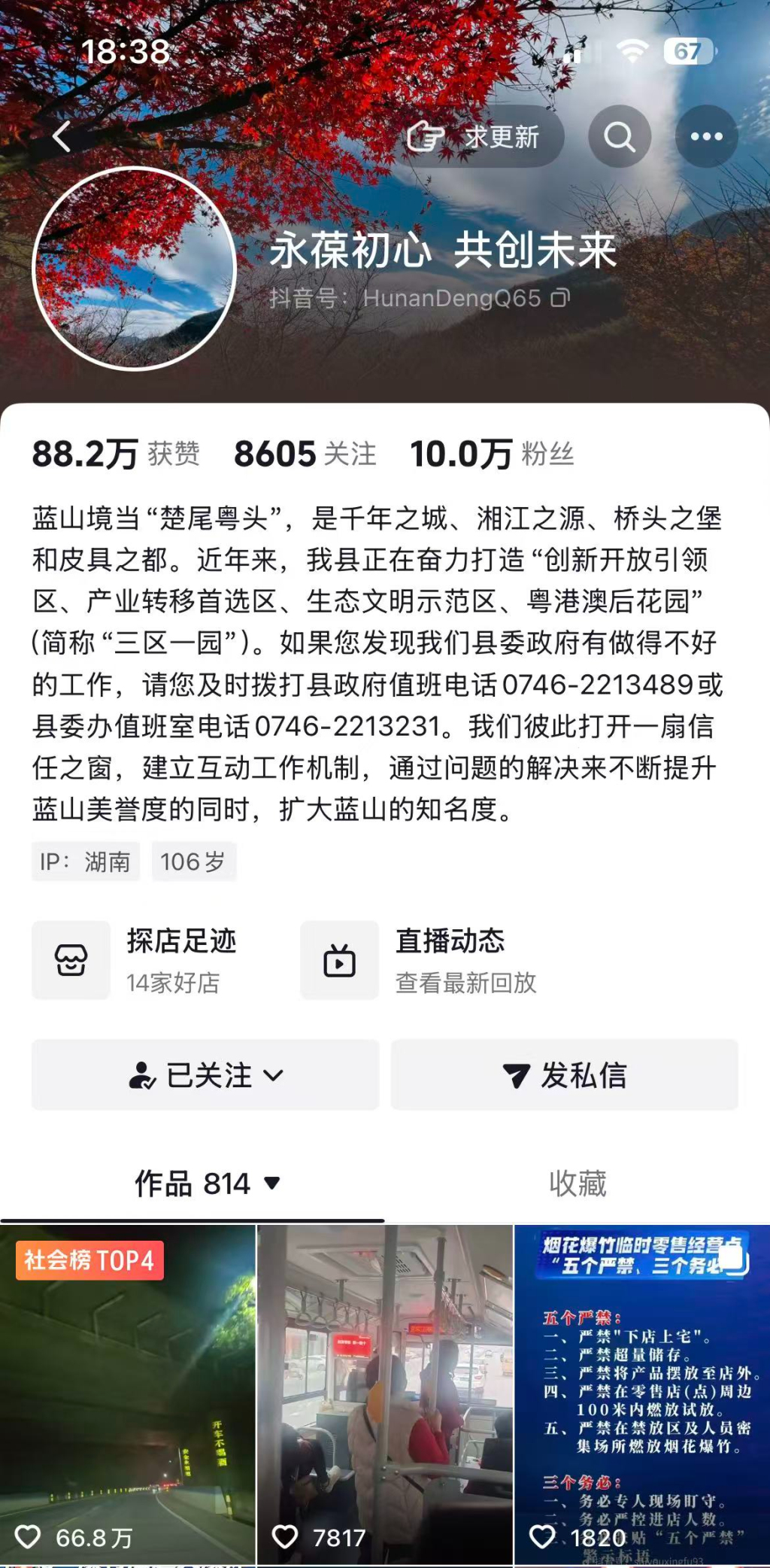 湖南蓝山县委书记抖音账号成民情留言板 粉丝已破10万