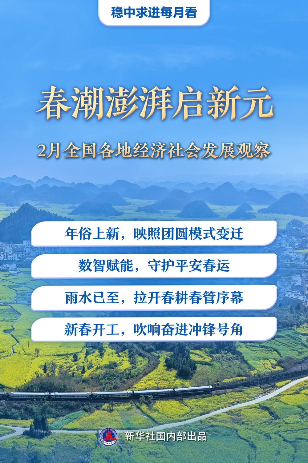 佳节欢腾,“异地过年”成流行趋势;春运大潮,奏响“流动中国”的团圆篇章;雨水时节,春耕春播春管拉开序幕;新春开工,各地吹响奋进号角……2月以来,全国各地经济社会发展呈现“春意盎然”的新图景。