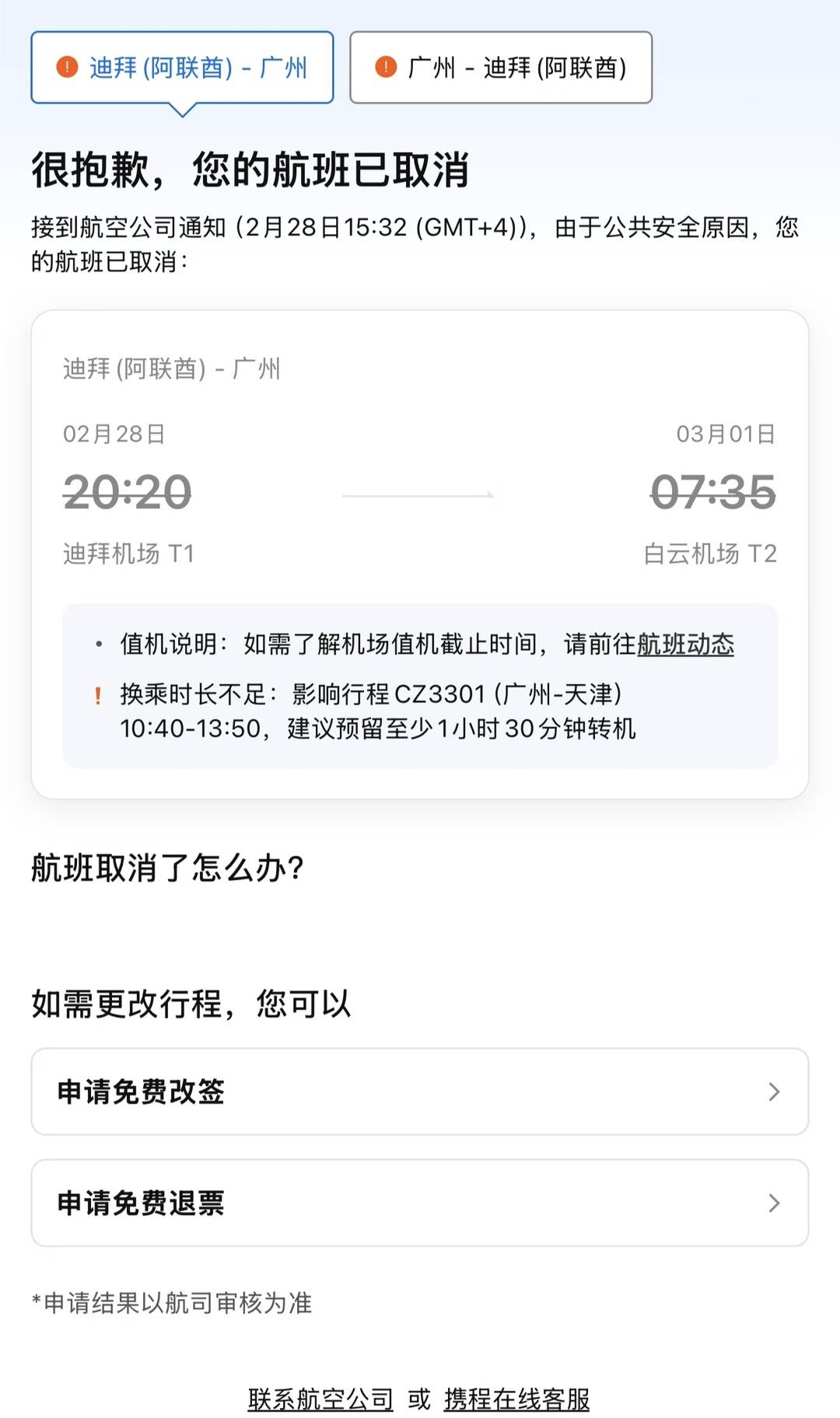 “就是马上订了迪拜的酒店,有个安身之处,然后联系航空公司改签。”李女士介绍,原定的南方航空航班取消后,准备把机票从2月28日改到3月3日。但没几个小时,又被通知取消,现在改签到了3月7日。