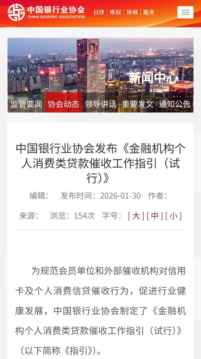 今年1月,中国银行业协会发布《金融机构个人消费类贷款催收工作指引(试行)》(网页截图)