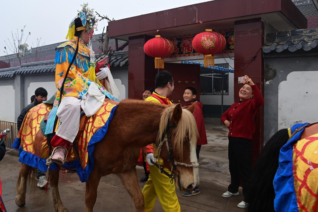 村民陈陇霞说:“去年我没‘抢’上社火表演的角色。幸好今年成功了,激动得睡不着,早早就赶过来化妆。”根据安排,丈夫将在巡游过程中为她牵马,一家人把热闹与期盼都融进了这场马社火里。