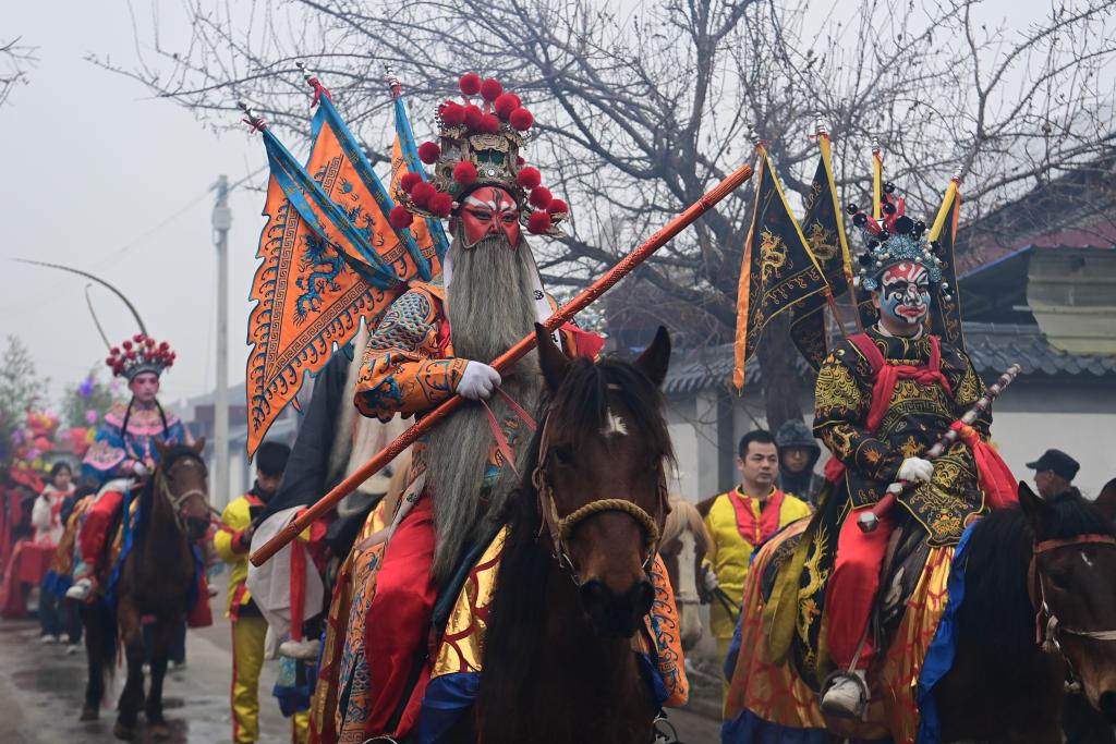 3月2日,陇县黄花峪村社火队在游演途中。新华社记者 邹竞一 摄